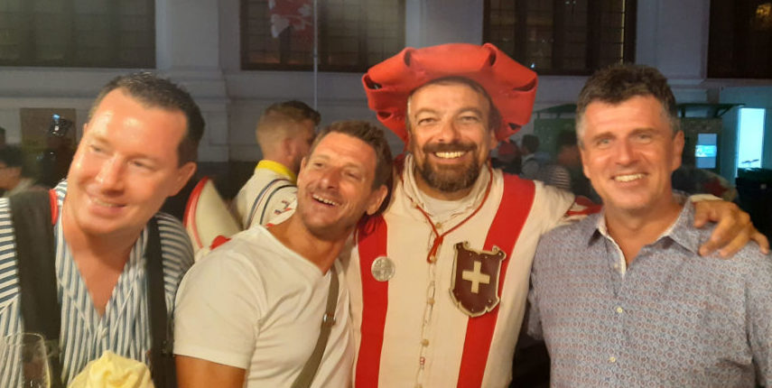 Étienne Blanc, membre du comité, dans son magnifique costume de Cent Suisse. Que ce soit au FC Lutry ou à la FeVi : toujours en rouge et blanc !